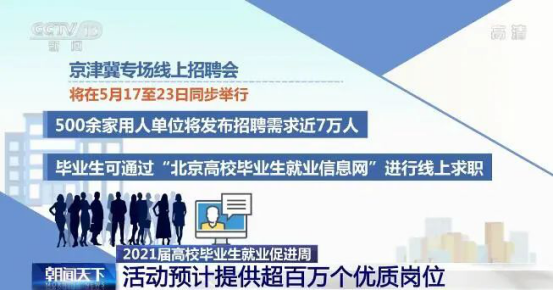 据了解,京津冀专场线上招聘会将在5月17日至23日同步举行,500余家用人单位将发布招聘需求近7万人,毕业生可通过“北京高校毕业生就业信息网”进行线上求职。同时,活动周期间,各地各行业各高校还将举办百场专场招聘和万场校园招聘活动,预计提供岗位超过100万个。