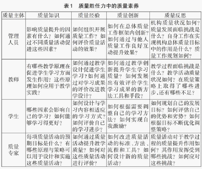 从个人层面来讲,质量主体需要具备相应的质量素养,才能够推动质量发展。本研究定义了四类质量主体,即管理人员、教师、质量专家、学生。其中管理人员主要是承担与质量工作相关行政管理工作的人员,如教务处、评估办公室等机构中的工作人员,他们是各项质量工作的发起者和组织者,确保质量活动的顺利完成;质量专家是评估专家、教学设计师、教学培训师等开展专业化质量发展任务的专家,他们是各项质量工作的设计者和具体实施者,确保质量活动的学术性。教师和学生的质量胜任力,直接决定了教与学的质量。表1对这四类主体,给出了四种从低到高的质量素养的定义,其中质量知识是知晓质量工作“是什么”和“如何做”;质量经验是应用质量策略去“做和评价”;质量创新是基于评价来进行创新性地改进;质量反思是分析挑战、质量状况与优势劣势并制订未来策略的能力。